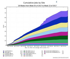 BESIII deneyinin fizik analizi için uluslararası GRID sisteminde yürütülen işlerin yığın histogramı. NEU'daki Yüksek Performanslı IBM Bilgisayarının bilgisayar kümesi tarafından gerçekleştirilenler en üstte gösterilmektedir.